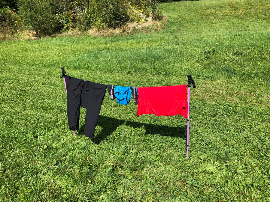 Nach einer sehr speziellen Nacht (mein Zelt stand unter einer Laterne, so konnte ich nie einschätzen, ob jetzt schon Tag ist oder immer noch Nacht) stand ich etwas später auf und zwar um 8:00. Es schiffte ununterbrochen. Ich dachte mir, dass ist wieklich der perfekte Tag, um eine Pause einzulegen. Ich packte also alles in meinen Rucksack und begann das Zelt von innen abzubauen. Sprich zuerst das Innenzelt, damit dies mehrheitlich trocken bleibt. Dürchnässt trottete ich also zum Busbahnhof, ass ein Brötchen und stieg in den Bus Richtung Jungholz ein. Viele Tageswanderer waren auch in den Bus gestiegen. Ich dachte mir, warum die alle bei diesem Wetter wandern gehen wollen. Es stigen sogar immer mehr Wandergruppen in den Bus, der die Passstrasse entlang schlängelte. Als ich mein Zelt aufgestellt hatte, ging es nur wenige Sekunden und der Himmel öffnete sich. Stück für Stück verschwanden die Wolken und es wurde so warm, dass ich die kurzen Hosen montieren und mich eincremen musste. Die Sonne nutze ich, um ein paar dreckige Kleider zu waschen. Nur ich hab ja har kein Spülmittel… Glücklicherweise hat zuvor jemand sein Waschmittel in den Mülleimer geworfen und noch mehr Glück für mich, es war nämlich noch nicht ganz leer… Checkpoint! Eine Garnitur gewaschen und auf einer Schnur, die ich zwischen meinen Wanderstöcken gespannt habe, aufgehängt.
