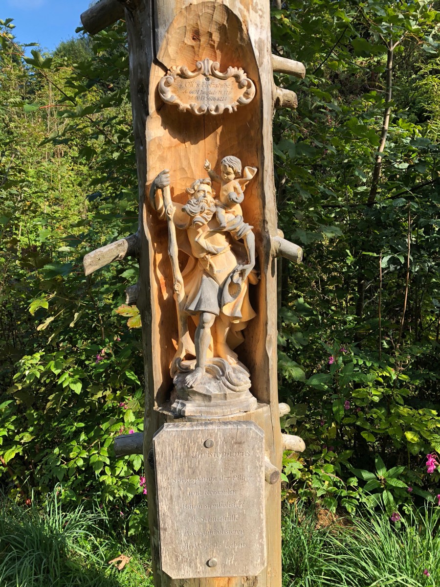 Da diese Gebiete hier sehr glaübisch sind, zieht sich täglich meine Strecke von Weidekreuz zu Weidekreuz und manchmal auch vorbei an kleinen Kapellen. Im schönen Jungholz durfte ich, dann ein besonders schönes Denkmal betrachten. Der heillige Christopherus von Hand in einen Baumstamm geschnitzt. Dazu die Innschrift: „Hl. Christophorus: Schutzpatron der Pilger und Reisenden, Baum symbolisiert die Schutzhülle, Äste die Wege des Lebens“ Ich kannte zwar die Geschichte vom Hl. Christopherus, wusste aber nicht, dass er der Schutzpatron ist. Zudem hängt ja ein Mosaik von ihm in der St. Markus Kirche. So errinerte dies mich an zu Hause und ich ging mit einem kleinen Lächeln weiter.