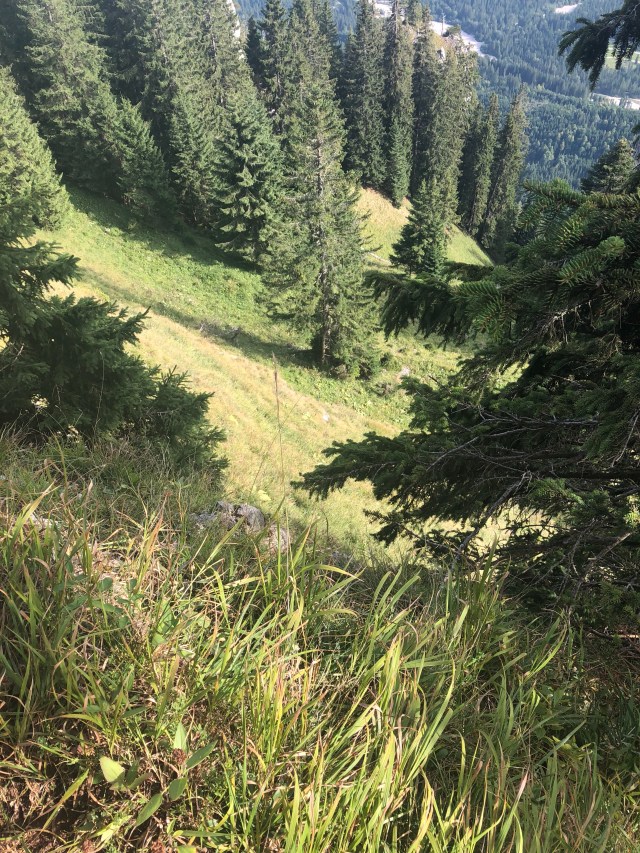 Sie zogen dann aber weiter der Gratwanderung entlang. Ich entschied mich aber für die Talvariante, nach dem ich so Schwierigkeiten beim Stauffnerhaus hatte. Es hies also alles den Berg wieder runter. Schon da hatte ich siw Vermutung, dass nur sehr wenige diesen Weg nehmen würden, da dieser sehe verwuchert war und nur eine kleine Schneise etwa 1.5 Fussbreit als Weg diente. Dieser wurde dann breiter bis es eine befahrbahre Strasse war. Da kamen mir auch zwei Wanderer entgegen.