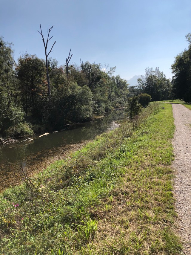 Die Route ist leider nicht wirklich schön. Vom Inn sieht man nicht wirklich viel, ausser ein kleiner Blick zwischen Gebüschen durch…
